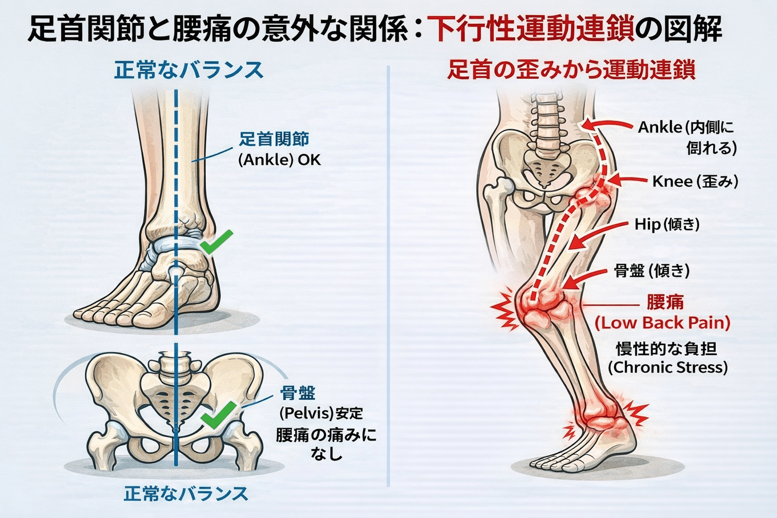 でも現場で体を見ていると、腰そのものよりも足首の使われ方が原因になっているケースが本当に多い。